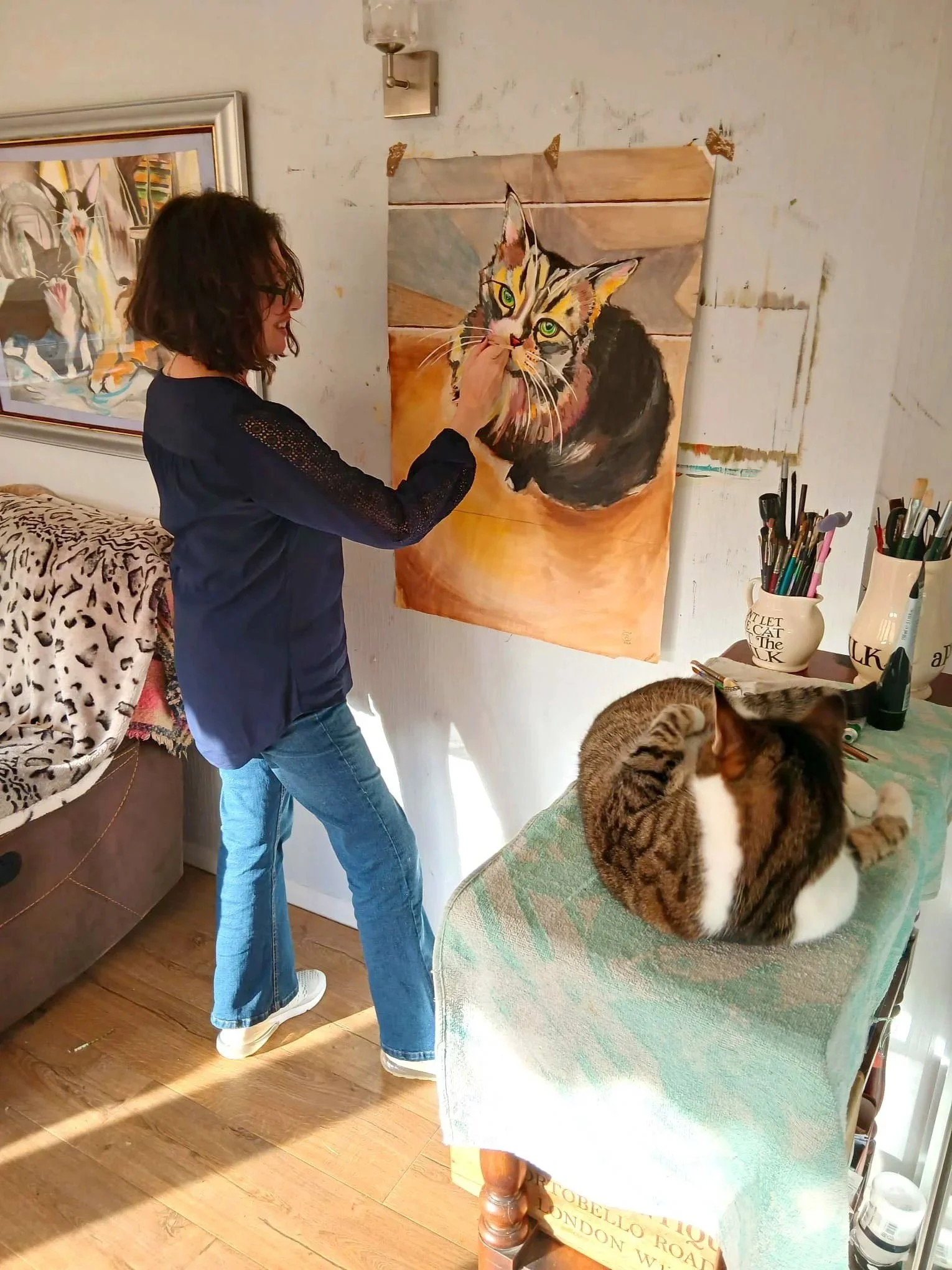 Every portrait begins with a moment like this — quiet light, a blank canvas, and a cat with a story. Evie brings those stories to life through colour, character, and emotion. She paints with warmth and instinct, capturing not just how your cat looks, but who they are: the mischief in their eyes, the softness in their posture, the personality that makes them family. Each piece is created by hand in her cosy studio, where she works surrounded by the things she loves — brushes, sunlight, and the occasional curious feline assistant. Her goal is simple: to give you a piece of art that feels alive, heartfelt, and utterly yours.